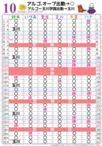10月、11月の営業日&スタッフ出勤日 2025年10月1日 最終更新日時 : 2025年10月2日 アルゴ.オーブ 10月、11月の営業日&スタッフの出勤日です 定休日以外で スタッフの休みのシフトが変わる事がございますので、都度 ご確認をお願いいたします
