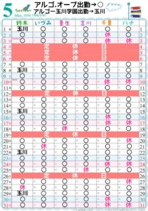 4月、5月の営業日&スタッフ出勤 2026年3月31日 最終更新日時 : 2026年3月31日 アルゴ.オーブ 4月、5月8の営業日&スタッフ出勤です 定休日以外で スタッフの休みのシフトが変わる事がございますので都度 ご確認をお願いいたします